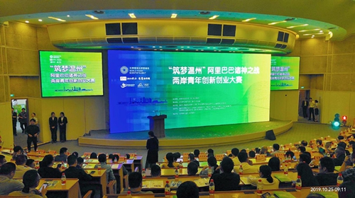 10月25日上午,溫州首屆2019世界青年科學(xué)家峰會(huì),“筑夢(mèng)溫州”阿里巴巴“諸神之戰(zhàn)”兩岸青年創(chuàng)新創(chuàng)業(yè)大賽在溫州市人民大會(huì)堂舉行,兩岸青年攜20個(gè)創(chuàng)新創(chuàng)業(yè)項(xiàng)目赴溫參加大賽,活動(dòng)設(shè)有兩岸青年創(chuàng)新創(chuàng)業(yè)項(xiàng)目路演、產(chǎn)業(yè)對(duì)接、兩岸青創(chuàng)論壇等環(huán)節(jié)。
