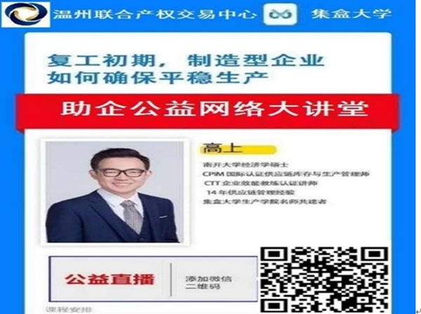 為全力協(xié)助企業(yè)復(fù)工復(fù)產(chǎn)工作,溫州聯(lián)合產(chǎn)權(quán)交易中心特邀集盒大學(xué)生產(chǎn)學(xué)院名師高上、劉立戶(hù)、黃海等三位老師,分別從“疫情期間對(duì)工廠價(jià)值鏈的影響、供應(yīng)鏈的運(yùn)作邏輯、具體落地方案建議、部分生產(chǎn)環(huán)節(jié)外包模式等內(nèi)容話題進(jìn)行直播分享講解。