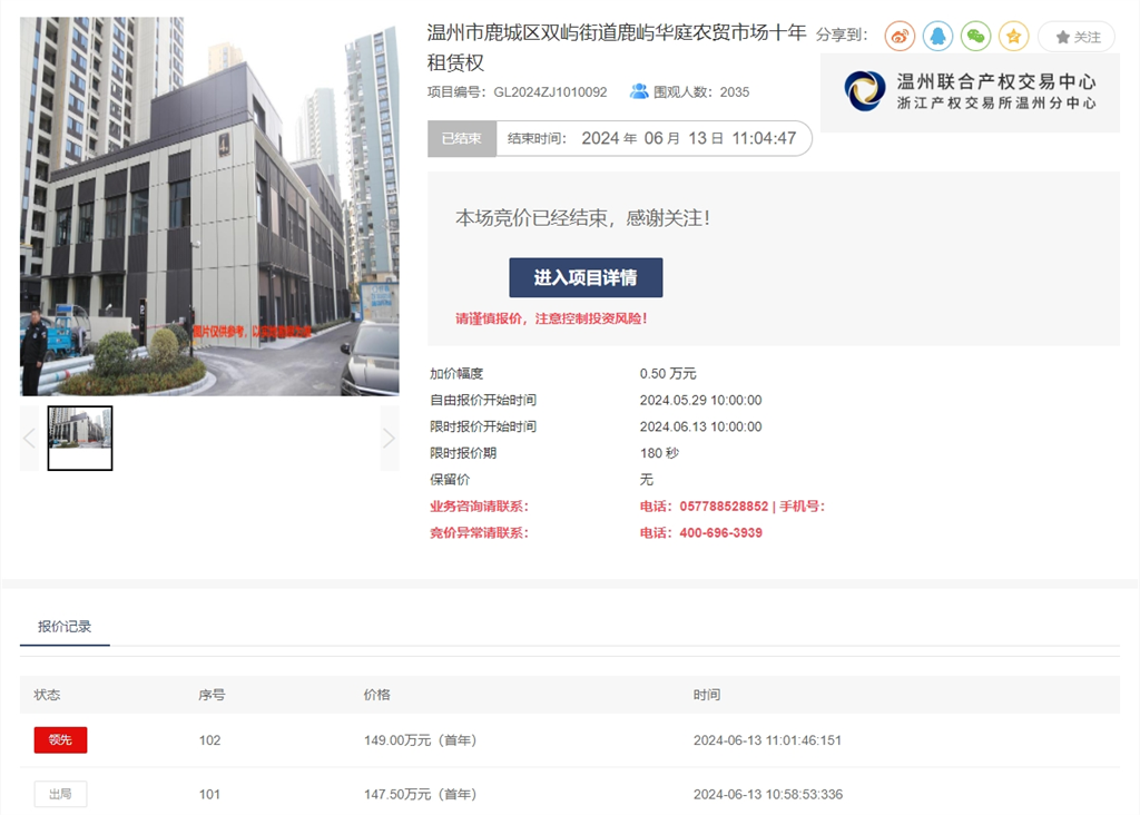 2024年6月13日,溫州聯(lián)合產(chǎn)權(quán)交易中心有限公司(下稱溫州聯(lián)交中心)受溫州市鹿城區(qū)國(guó)有資產(chǎn)經(jīng)營(yíng)集團(tuán)有限公司委托,在“浙交匯”平臺(tái)掛牌的溫州市鹿城區(qū)雙嶼街道鹿嶼華庭農(nóng)貿(mào)市場(chǎng)十年租賃權(quán)項(xiàng)目經(jīng)過102輪充分競(jìng)價(jià)順利成交。項(xiàng)目以首年租金70萬元的價(jià)格掛牌披露,最終以首年租金149萬元的價(jià)格成交,溢價(jià)79萬元,溢價(jià)率高達(dá)112.86%。