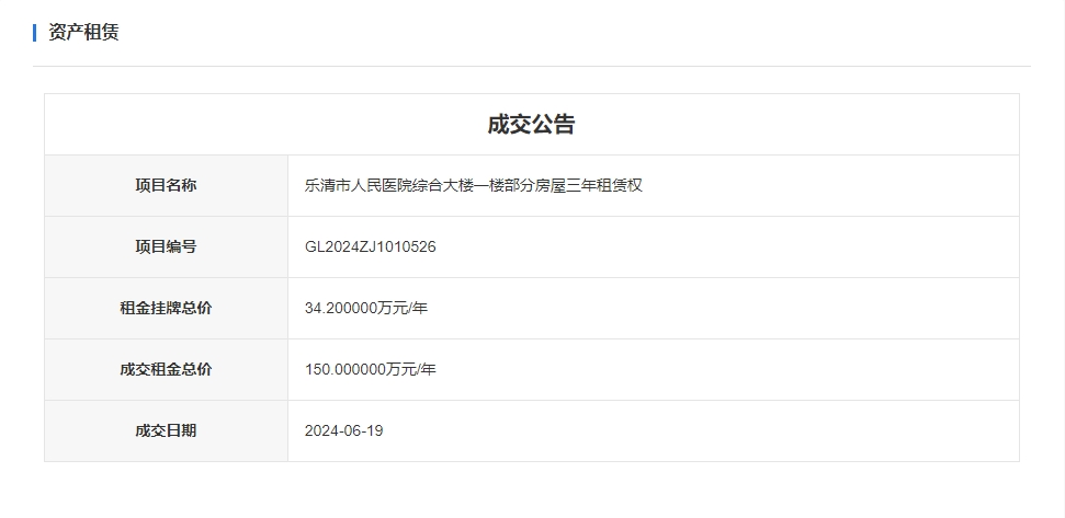 近日,受出租方委托溫州聯(lián)合產(chǎn)權交易中心有限公司掛牌的樂清市人民醫(yī)院綜合大樓一樓部分房屋三年租賃權在“浙交匯”平臺順利成交。項目以首年租金34.2萬元的價格掛牌,經(jīng)過充分競價,最終以首年租金150萬元的價格成交,溢價115.8萬元,溢價率高達338.6%。