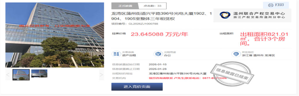 此次成交的5宗資產(chǎn)中,光電大廈1902、1904、1905室整體租賃項(xiàng)目尤為亮眼。該項(xiàng)目以821.01㎡的大面積規(guī)模,通過整體打包出租模式,實(shí)現(xiàn)70.94萬元總租金、23.65萬元首年租金的優(yōu)異成果,不僅為大型企業(yè)提供了一站式辦公解決方案,更打破了零散出租的低效壁壘,讓國有資產(chǎn)從 “分散管理”向“集中增效” 實(shí)現(xiàn)跨越式升級(jí)。與此同時(shí),平臺(tái)創(chuàng)新設(shè)置1年靈活租期選項(xiàng),精準(zhǔn)適配科技企業(yè)短期辦公需求,成功吸引溫州才華智能網(wǎng)絡(luò)、浙江卓普數(shù)字科技等5家優(yōu)質(zhì)科技網(wǎng)絡(luò)企業(yè)入駐,充分彰顯了服務(wù)的靈活性與市場(chǎng)敏感度。